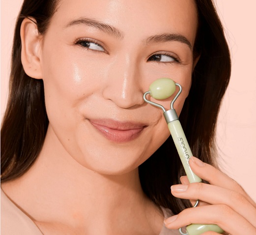 Jade Roller: Start at the chin and roll outward toward the hairline. Continue sweeping movement up one side of the face until you reach the forehead. Repeat this movement on the other side of the face. Focus on the jawline and cheekbones and sweep down the neck to depuff the face.
